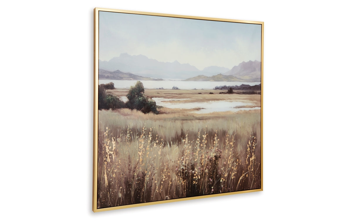 This wall art puts a peaceful spin on hanging decor. Its quiet landscape invites you to a lakeside field, with rolling mountains in the background that bring depth to the design. Hand-painted and gold leaf embellishments make each piece unique.