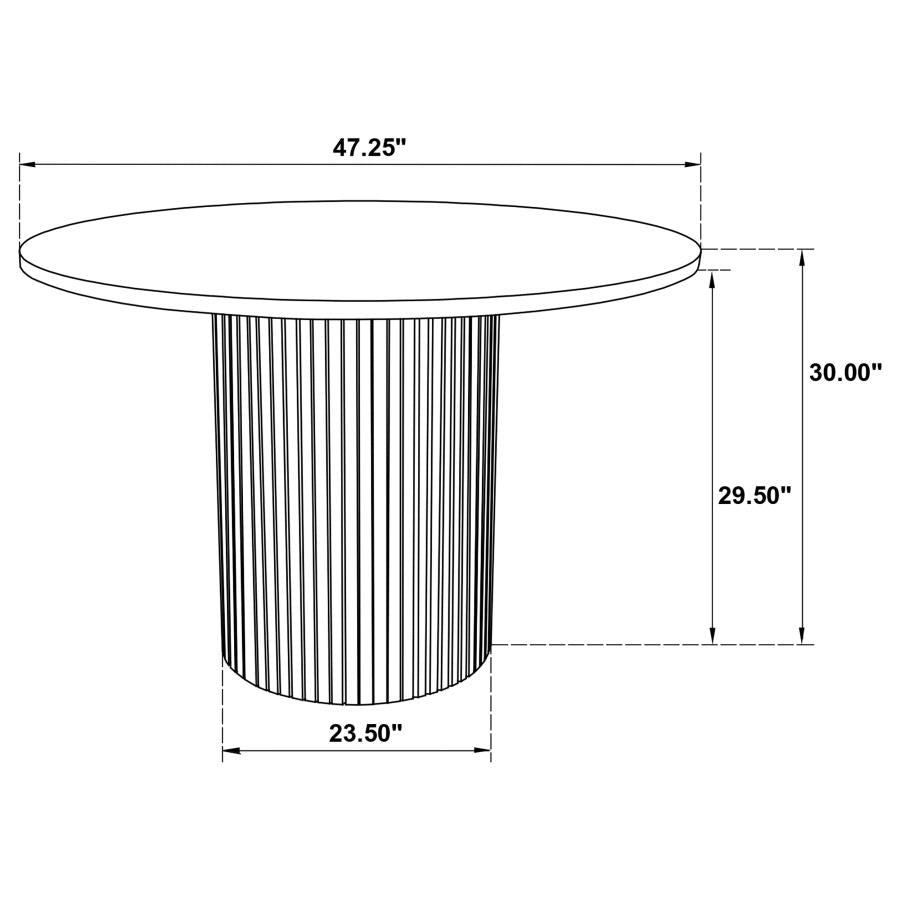 Round dining table showcases a thick top and a fluted pedestal base that adds subtle texture while keeping the silhouette clean. Built with rubberwood, an engineered wood core, and a veneer surface, the circular profile feels cohesive from edge to base. The centered pedestal keeps leg space open and seating flexible, helping chairs tuck in neatly. Use this kitchen table in dining rooms and breakfast nooks where a compact round shape supports everyday meals and easy conversation without crowding floor space.