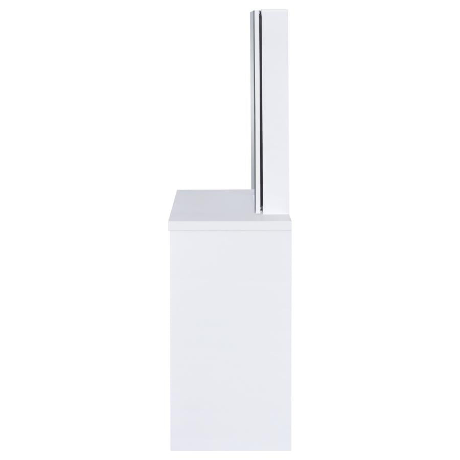 Contemporary style meets clever storage in a vanity set designed to keep your secrets beautifully organized. The clean white finish keeps the silhouette bright and modern, while the sliding mirror reveals concealed jewelry compartments behind its reflective surface. A spacious drawer and lift-top stool add even more hidden storage, turning the set into a practical prep station with an easy, polished presence.