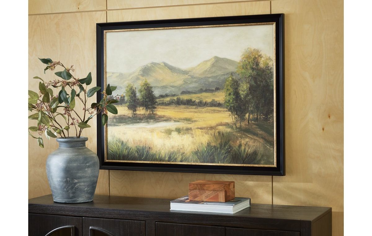 Take in the tranquil ambiance of this wall art. A muted palette captures a peaceful meadow with mountains majestically rising in the background. Hand painted embellishments provide the finishing touch to this soothing landscape canvas.