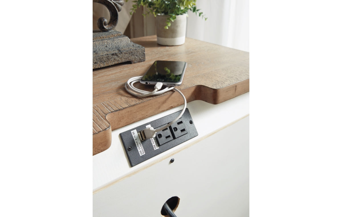 Elevating the art of traditional cottage styling, this nightstand is your dream bedroom retreat realized. Its antiqued two-tone aesthetic blends a chipped white with a distressed wood finished top for added charm. Framed drawer fronts and decorative corbels add refinement, while bail pulls in a dark bronze-tone finish lend a classic touch. Subtly placed USB/electrical outlets meld vintage inspiration with modern convenience.